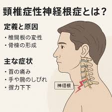 頸椎症性神経根症は、首の骨(頸椎)の変形や加齢による変化で神経根が圧迫される病気です。